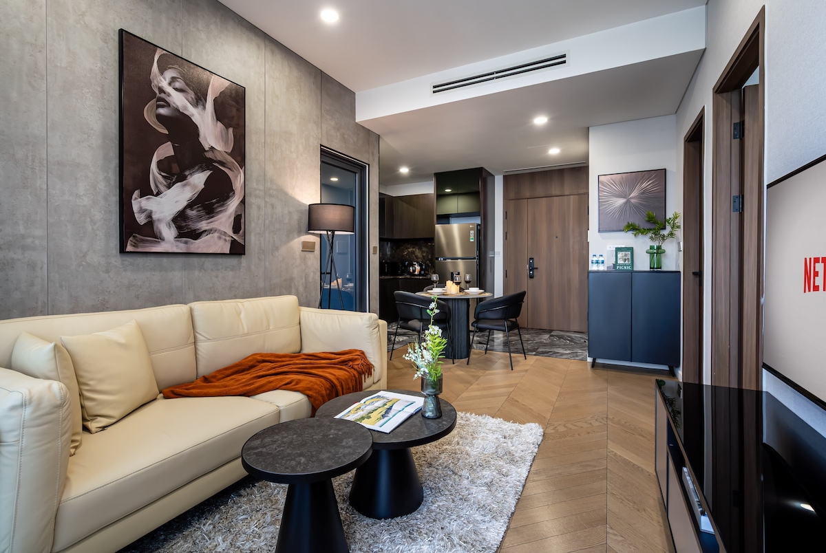 Die Wohnung ist wunderschön im Wabi Sabi-Stil gestaltet und befindet sich im D1Mension Residences Gebäude, District 1 Zentrum, Kunststil, hochwertige Resorteinrichtungen, besonderer High-Top-Pool_Spa-Bad-Pool_Dampfbad, Fitnessraum_Besprechungsraum, privates Arbeitszimmer, Garten-Aquarium, Pizza 4' direkt in der Lobby, Garten-Grillplatz, Kinderspielbereich, große Lounge, alle Schlafzimmerfenster und Balkone sind luftig, einzigartig, luxuriös, stilvolle Wohnung