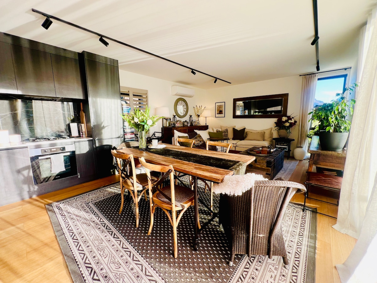 Atemberaubende Aussicht von deiner Lounge und deinem Schlafzimmer aus. Diese moderne (neue, 2025) unabhängige Einheit mit separatem Eingang und einer voll ausgestatteten Küche bietet einen atemberaubenden Blick auf die Berge und den Bauernhof. Es ist warm, sonnig und friedlich. Entspanne dich, entspanne dich oder entspanne dich mit all den actionreichen Aktivitäten vor deiner Haustür. 2 Minuten vom Jacks Point Golf Club, 4 Minuten zur Remarkables Skigebiet-Zugangsstraße, 10 Minuten zum Flughafen und zum Einkaufszentrum Frankton. Es gibt Seezugang und Wander- und Wanderwege direkt vor deiner Haustür.