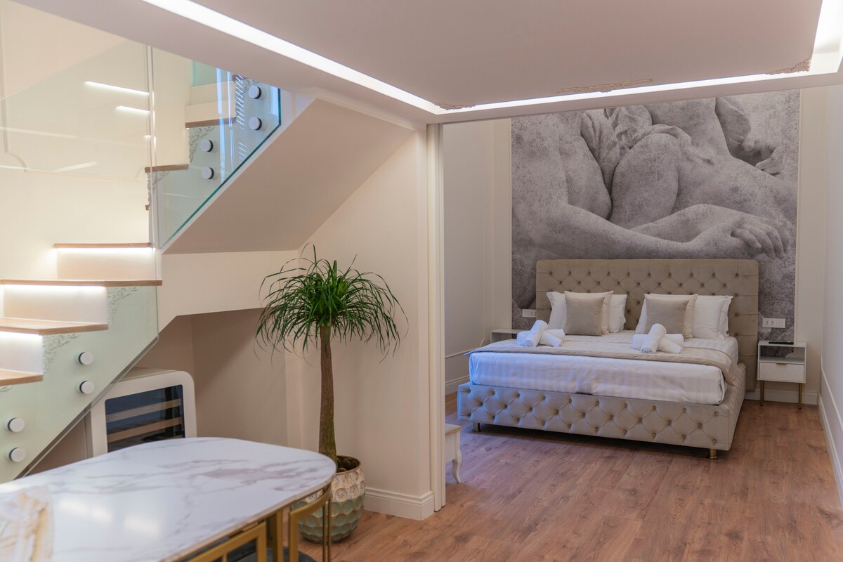 Elegante appartamento su due livelli con finiture di pregio, dotato di cucina, salone, camera da letto e bagno. La Suite Diamond fa parte del complesso del 16b Suites, un edificio storico con servizio di accoglienza a 400 metri da Piazza di Spagna, situato nel rione del lusso di Roma tra Via del Babuino e Via del Corso.