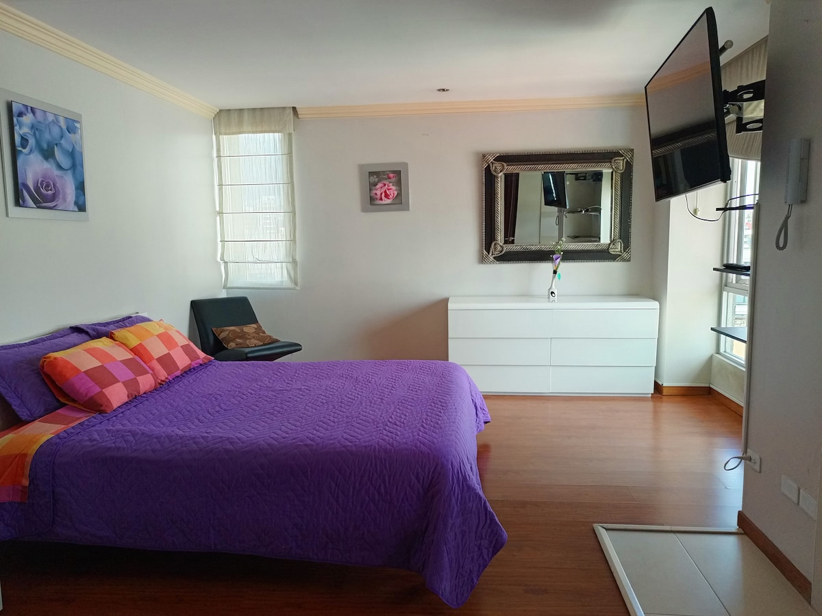 Schöne und gemütliche Wohnung mit zwei Schlafzimmern im 16. Stock eines Luxusgebäudes mit einer unglaublichen Aussicht, in der besten Gegend von Quito gelegen, nur wenige Schritte vom La Carolina Park, Megamaxi, Quicentro und dem Atahualpa-Stadion entfernt. Es liegt in der Nähe von Restaurants, Einkaufszentren, Apotheken, Cafés, Supermärkten, Kinos und dem Gebäude: Swimmingpool, Sauna, Whirlpool, Businesscenter, Kinderclub, Lounge-Bar, Billardtisch, Terrasse. Es verfügt rund um die Uhr über einen Sicherheitsdienst und kostenlose Parkplätze.