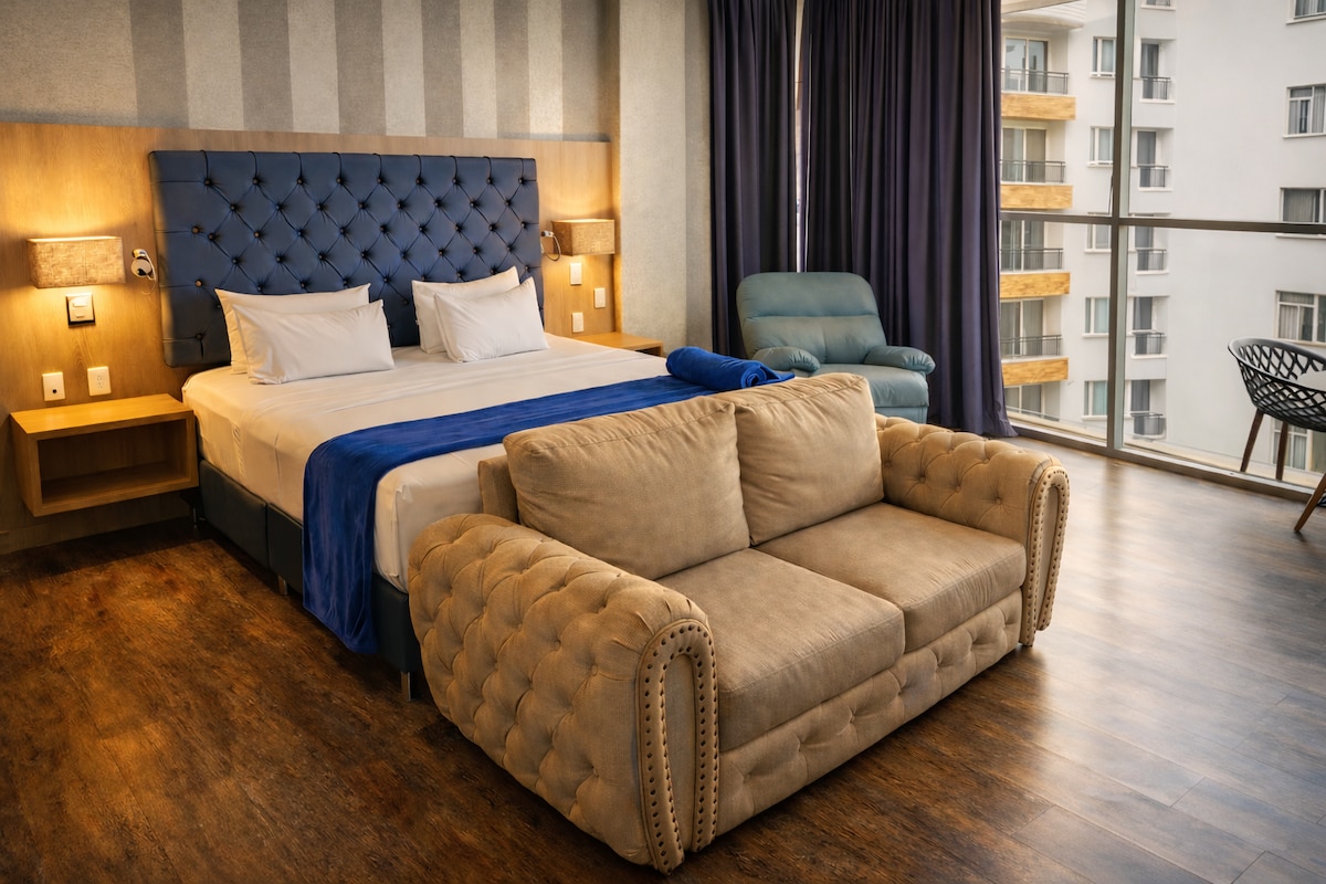 Premium Suite in Altos de Pan de Azúcar: Spacious room with queen and king beds, living area, minibar, and air conditioning. Enjoy shared wet areas with jacuzzi, steam room, and pool. Prime location 5 mins from Cabecera and CC Cacique, with an unparalleled view of the city