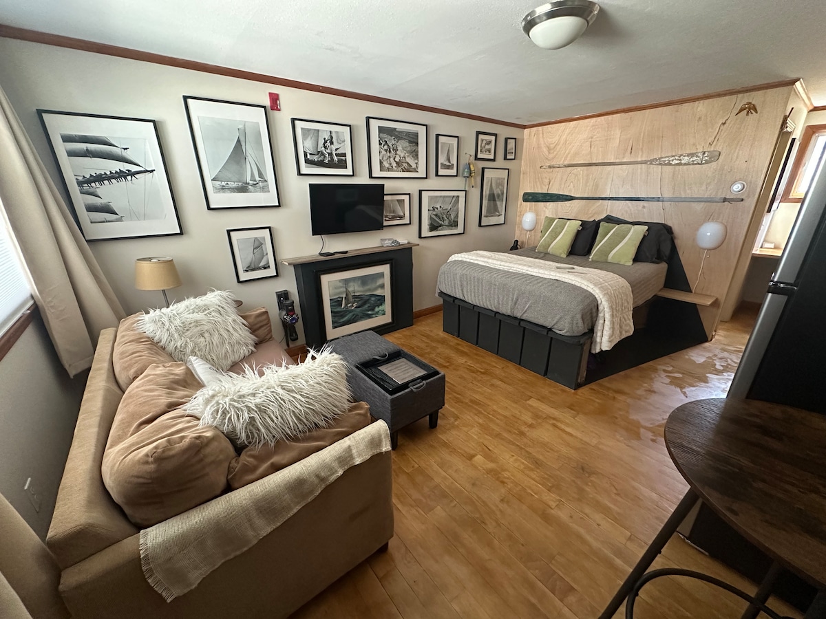 The Boathouse was a part of the Manomet Coast Guard Station on Manomet Point. When the station was decommissioned and eventually dismantled, the Boathouse was moved and attached to our home as a separate space. Guests will have full and private access to this beautiful and spacious 1,800 square foot home with 11 foot vaulted ceilings and antique southern exposure windows. The open first floor has a living room, kitchen, pool table and bathroom. A spiral staircase leads to the bedroom.