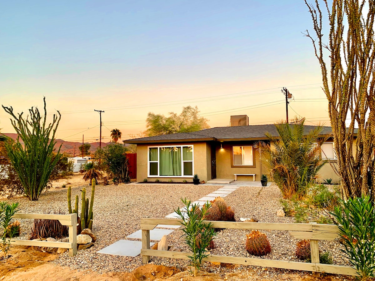 Genieße unser zentral gelegenes Wüstenhaus. Unser gemütlicher und erfrischter Bungalow aus der Mitte des Jahrhunderts wurde entworfen, um deinen Aufenthalt komfortabel und entspannend zu machen. Erstaunliche Sonnenuntergänge und Sternenbeobachtung direkt im privaten Hinterhof. Das Hotel liegt 8 Minuten vom ruhigeren Nordost-Eingang zum Joshua Tree NP entfernt. Du kannst deine Wüstenabenteuer beginnen, anstatt in einer Schlange von Autos zu warten. Zu Fuß erreichst du Geschäfte in der Innenstadt, Starbucks und den besten Kombi-Pho- und Donut-Shop – das bedeutet das Beste aus Natur und Stadtleben!