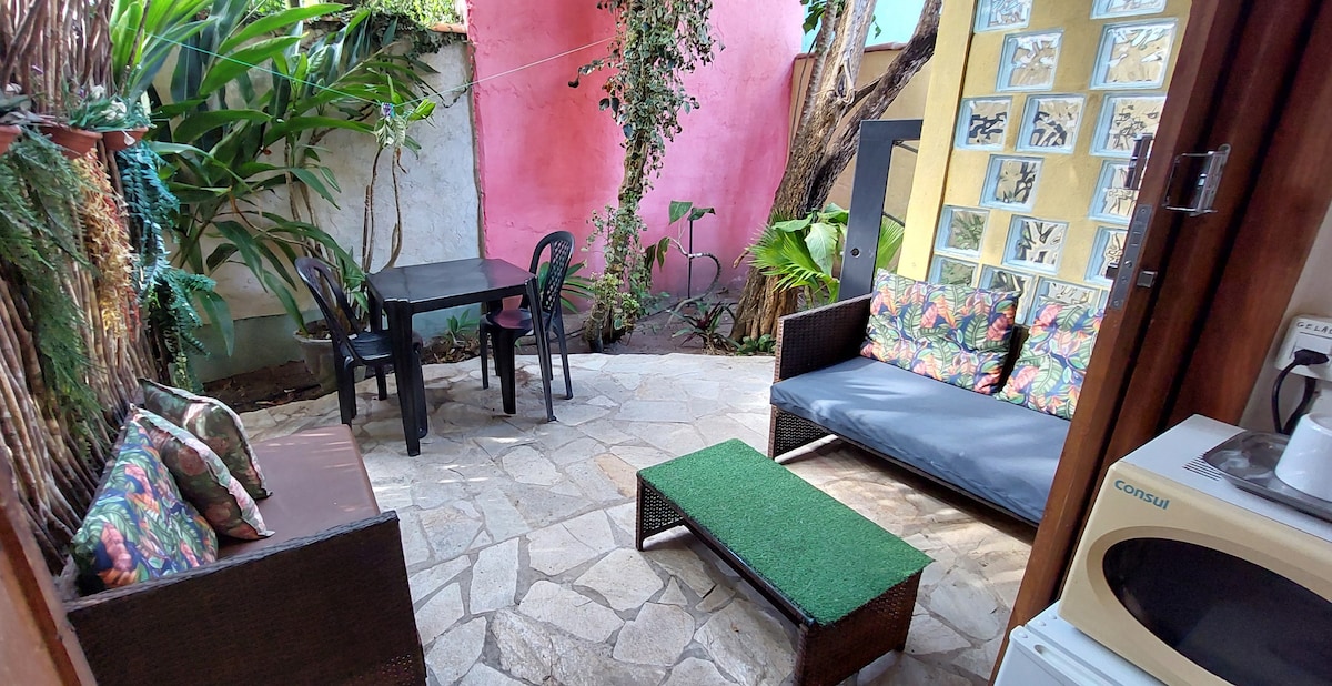 Chalezinho Suite — Cozy & Independent Perfect for guests seeking privacy, comfort, and convenience. What the suite offers • Air conditioning • Wi-Fi • Private porch with hammock, table, and 2 chairs • Compact kitchen (minibar, microwave, small electric oven, coffee maker, blender, clay water filter) • Great for preparing your own breakfast and light snacks Shared areas • Outdoor patio with hammock • Outdoor shower