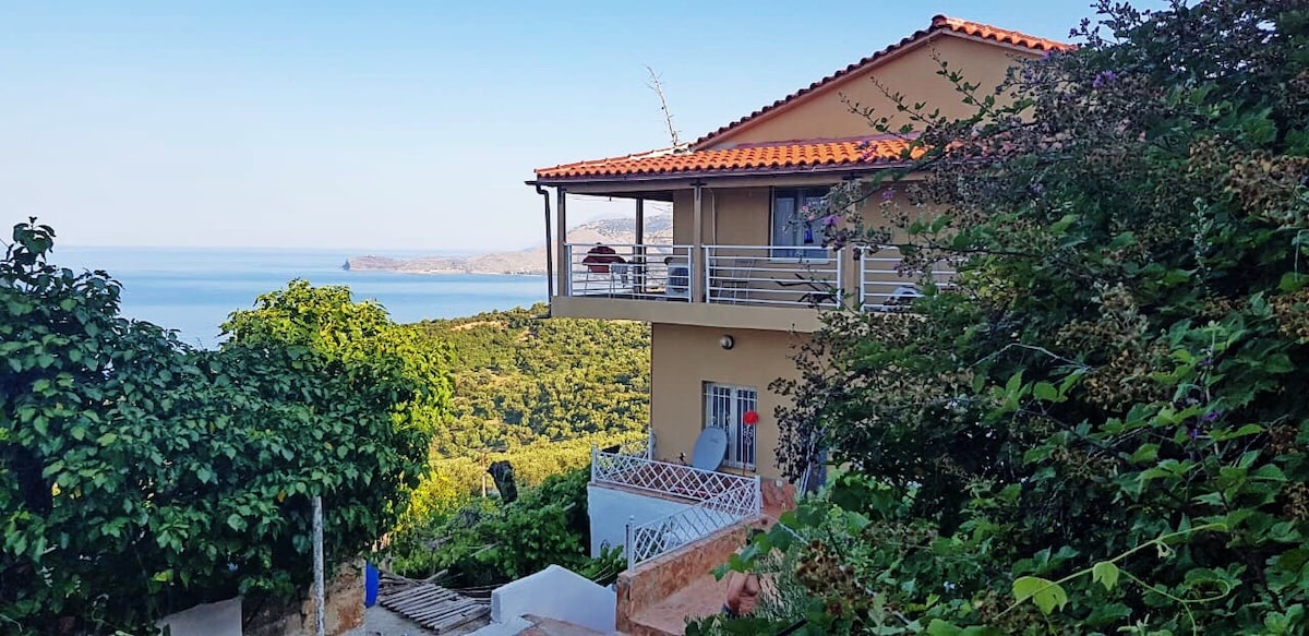 Balkon mit Blick auf das Ionische Meer und unter jahrhundertealten Olivenbäumen