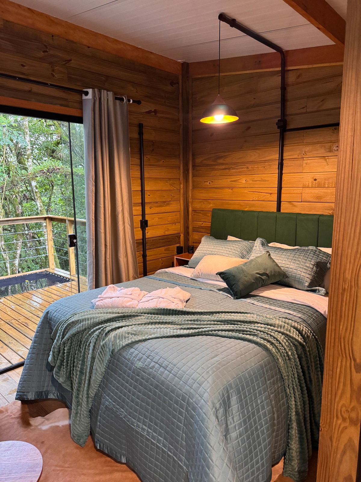 A Cabana Encanto da Natureza é um refúgio de 57 m² com ambientes integrados e muita luz natural. Construída a 2,30 m do solo, oferece a sensação única de estar em uma casa na árvore, cercada pelo verde. Ideal para descanso e conexão com a natureza, conta com hidromassagem para relaxar e ar-condicionado para total conforto. Capacidade: 1 casal (2 pessoas).