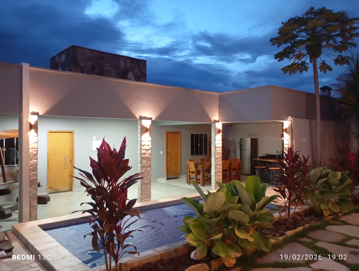 Der HAUSCHARME DO CERRADO ist wunderbar, in der Nähe des Zentrums, gemütlich und vertraut, es verfügt über 3 Schlafzimmer, eine Suite und alle mit Klimaanlage, 1 Doppelbett, ein Einzelbett, Doppelbett- und Badwäsche, Aras, Maleiros und Verdunkelungsvorhänge. Sala com Smart-TV,,Sky, Netflix und WLAN; Komplette Küche; Lavabo; Freizeitbereich mit Grill, Gefrierschrank, beheiztem Pool (Solar), Wasserfall und Liegestühlen; Redário; Garage für 3 Autos.