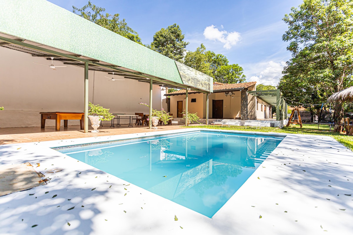Genießt ein ruhiges Haus mit Pool und großem Garten in Piribebuy, Barrio Jakarey – mitten im Grünen, ca 6 km vom Zentrum Piribebuy entfernt. Zwei Schlafzimmer und eine Schlafcouch bieten Platz für Familien und Paare. Küche, Bad, WLAN, Terrasse und Parkplatz sorgen für komfortable und entspannte Tage in der Natur.