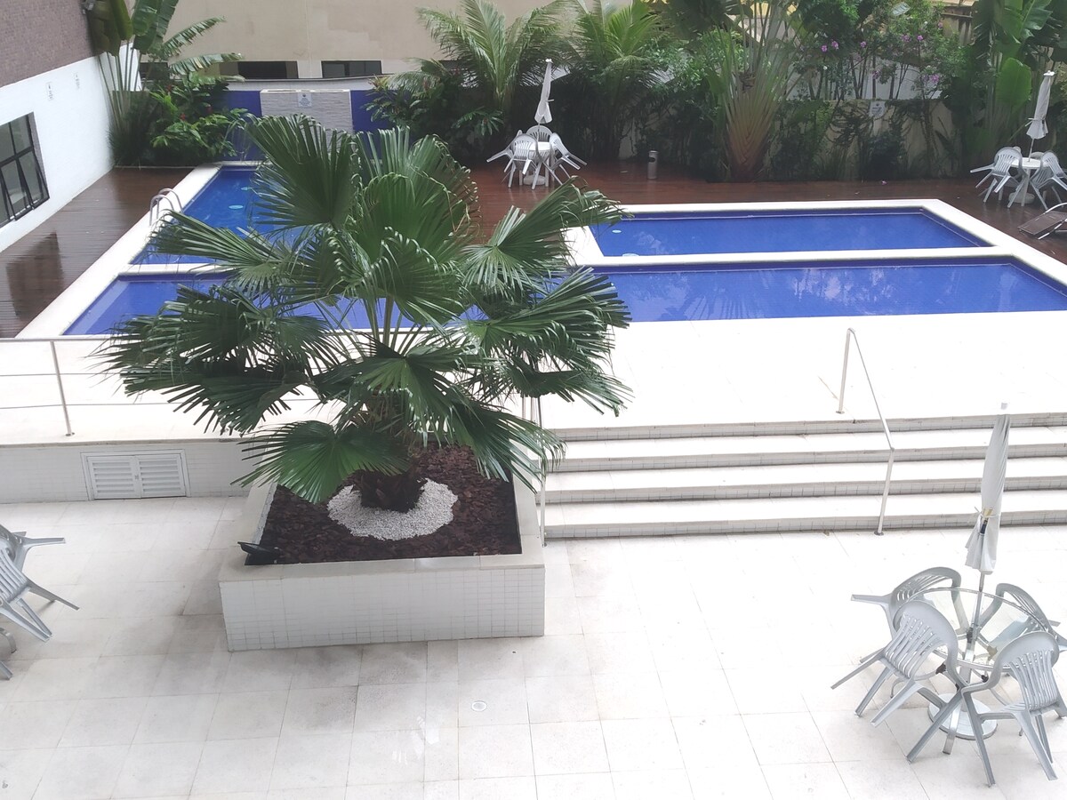 Genießen Sie die Erfahrung, nach Guarujá zu reisen, mit den Annehmlichkeiten unserer Wohnung: - Privilegierte Lage; - Strandservice (4 exklusive Stühle und Sonnenschirm) - Hallenbad und Fitnessraum. Mit dem Vorteil, nur wenige Schritte vom Strand entfernt zu sein. Die Lage ist sowohl für die Erholung als auch für die Nutzung der Promenade mit Restaurants, Geschäften und dem Einkaufszentrum La Place geeignet. Oder um im Home Office in der Nähe des Meeres und der Stadt Santos zu arbeiten.