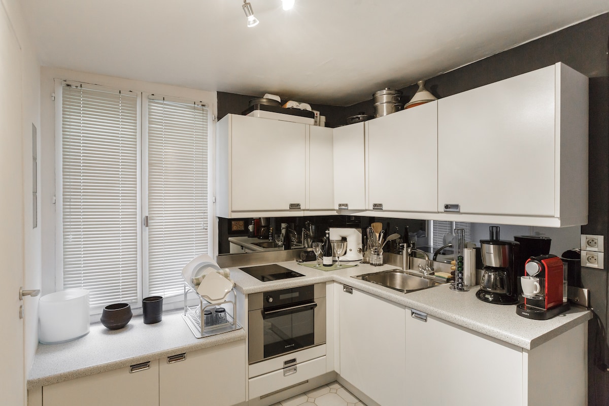 Das Apartment liegt im Herzen von Paris, im Marais-Viertel, in der Nähe des Centre Beaubourg – Georges Pompidou, des Picasso-Museums und des Hotels de Ville. Es gibt einen Aufzug, um den 3. Stock zu erreichen. Das Innere von 60 Quadratmetern ist in der Regel Pariser, mit originalen Holzböden, Leisten und Kamin. Die Dekoration kombiniert verschiedene Stile, um eine warme und komfortable Atmosphäre zu bieten. Es gibt auch eine kleine Terrasse mit Oliven-, Orangen- und Zitronenbäumen.