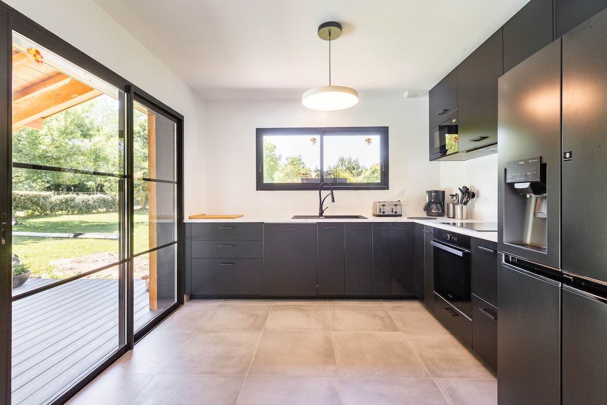 Neues Haus umgeben von Wald neben dem Radweg und den Stränden der Küste der Landes Es besteht aus einem Wohnzimmer mit amerikanischer Küche, 3 Schlafzimmern, darunter 1 Master-Suite mit Bad und WC, sowie einem weiteren Bad und separatem WC. Glasfaser-Internet 🛜 Draußen gibt es einen beheizten Südpool von 4 x 8,5 m, von April bis 11. November, mit Landschaftsgarten und 110 m2 Holzterrasse. Strand und Golf von Moliets et Maa 10 Minuten entfernt Vieux Boucau 15 Min. Hossegor 28 Min. Biarritz 50 Min.
