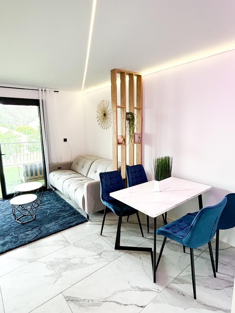 Incroyable petit cocon girly, tout confort à 5 minutes à pied des plages, bars et restaurants les plus prisés de Saint Aygulf. Les 20m2 de ce Studio tout juste rénové ont été optimisés pour permettre un couchage pour 3 personnes (1 vrai lit dans une petite alcôve et 1 lit dans le canapé convertible). L'espace de vie est petit, mais le Studio propose une vraie cuisine (plaques, lave-vaisselle, four) et une terrasse de 16m2 pour manger dehors. La décoration originale rendra votre séjour unique!