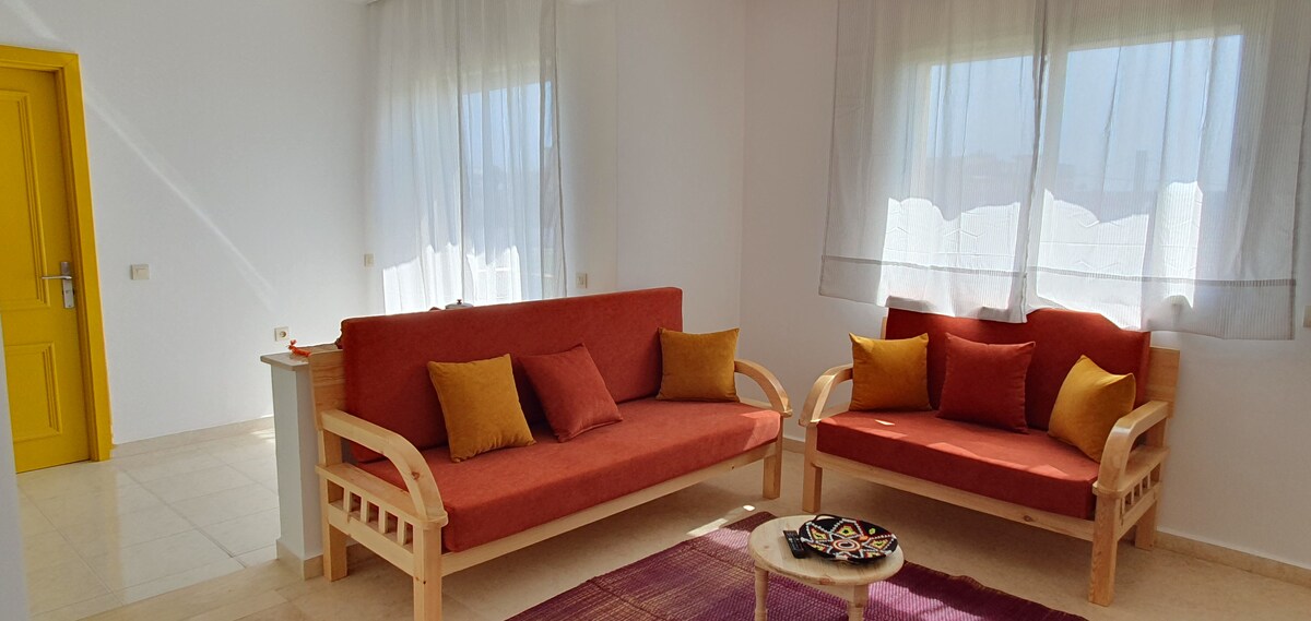 Bienvenue à Essaouira Installez-vous dans un appartement confortable et spacieux, situé à la Résidence Jawhara, une résidence calme et sécurisée 24h/24 avec parking gratuit juste devant. À seulement 4 minutes à pied de la plage, c’est le logement idéal pour profiter d’Essaouira sans voiture, tout en restant à l’écart du bruit touristique.