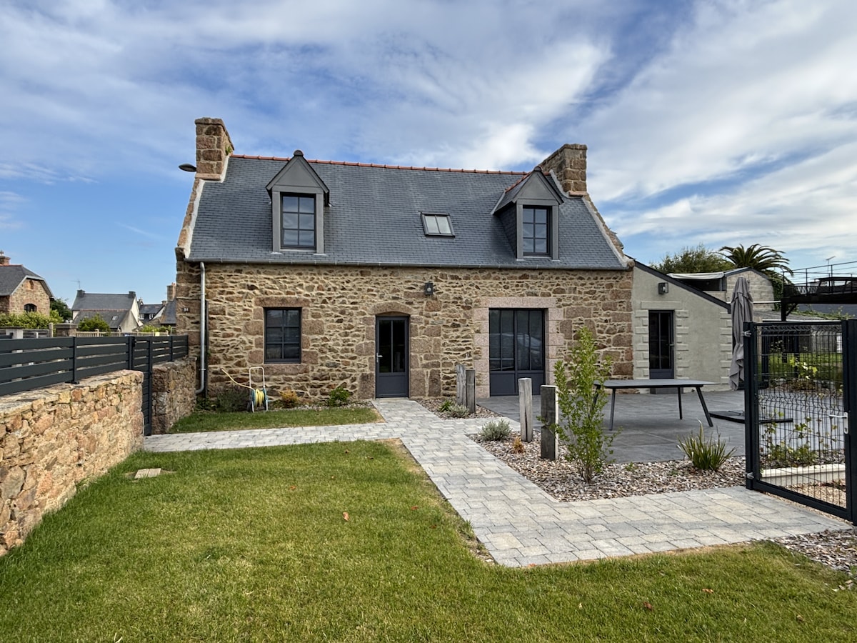 Sur la Côte de Granit Rose, à 2 pas du port, de la plage de La Bastille, du sentier des Douaniers, Maison de pêcheur rénovée avec 2 jardins avant et arrière, terrasses. Le jardin avant est fermé par des portillons à serrure. Stationnement privé derrière la maison, accessible par une voie privée (espace bitumé en haut du jardin arrière). Calme et tranquillité, commerces à proximité. Idéal pour famille