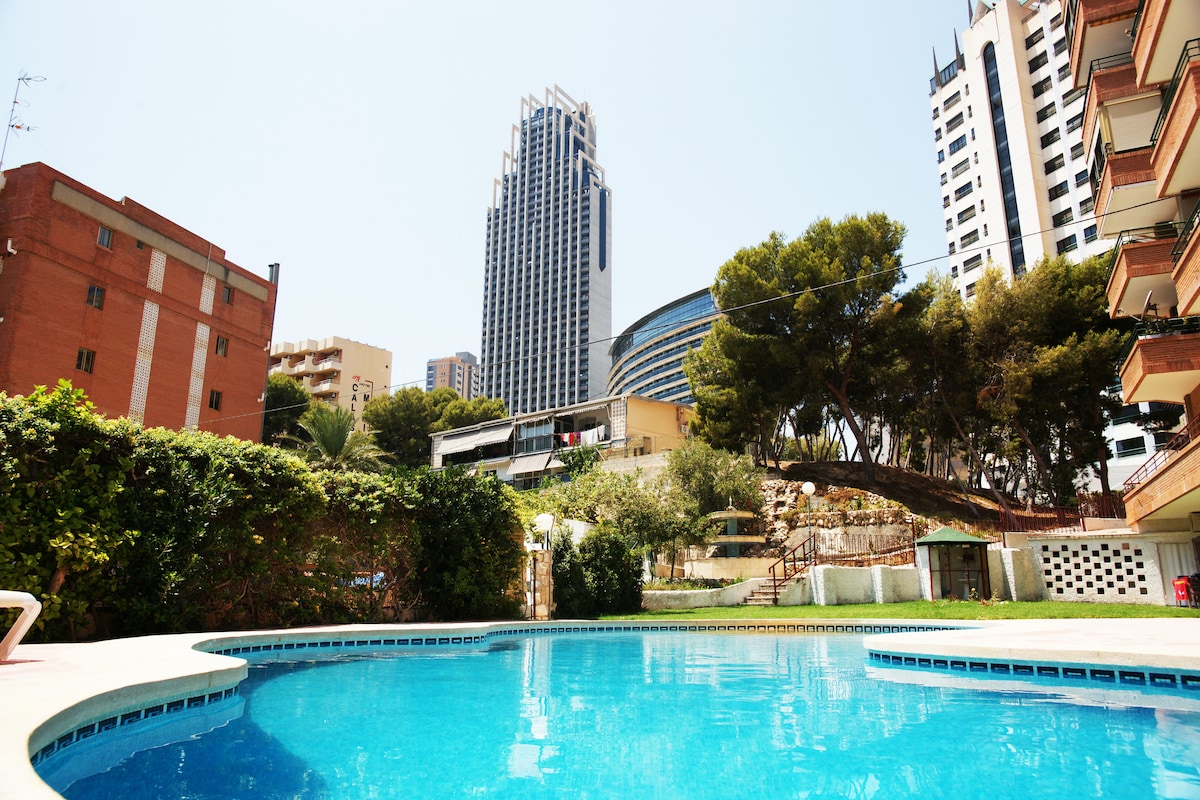 Eine helle, renovierte, sehr komfortable Wohnung von 50 m2 mit einem Balkon und guter Aussicht auf den Pool und Benidorm. Der Poolbereich verfügt über Liegestühle und Sonnenschirme zur freien Verwendung und hat einen Rettungsschwimmer. Das Hotel liegt 5 Gehminuten vom Strand Levante entfernt, in der Ecke von Loix, einer der Freizeitbereiche von Benidorm. Umgeben von Restaurants, Bars, Diskotheken, Supermärkten, Casino und Flohmarkt, ohne dass Sie das Auto nehmen müssen. Perfekt für einen angenehmen Aufenthalt.