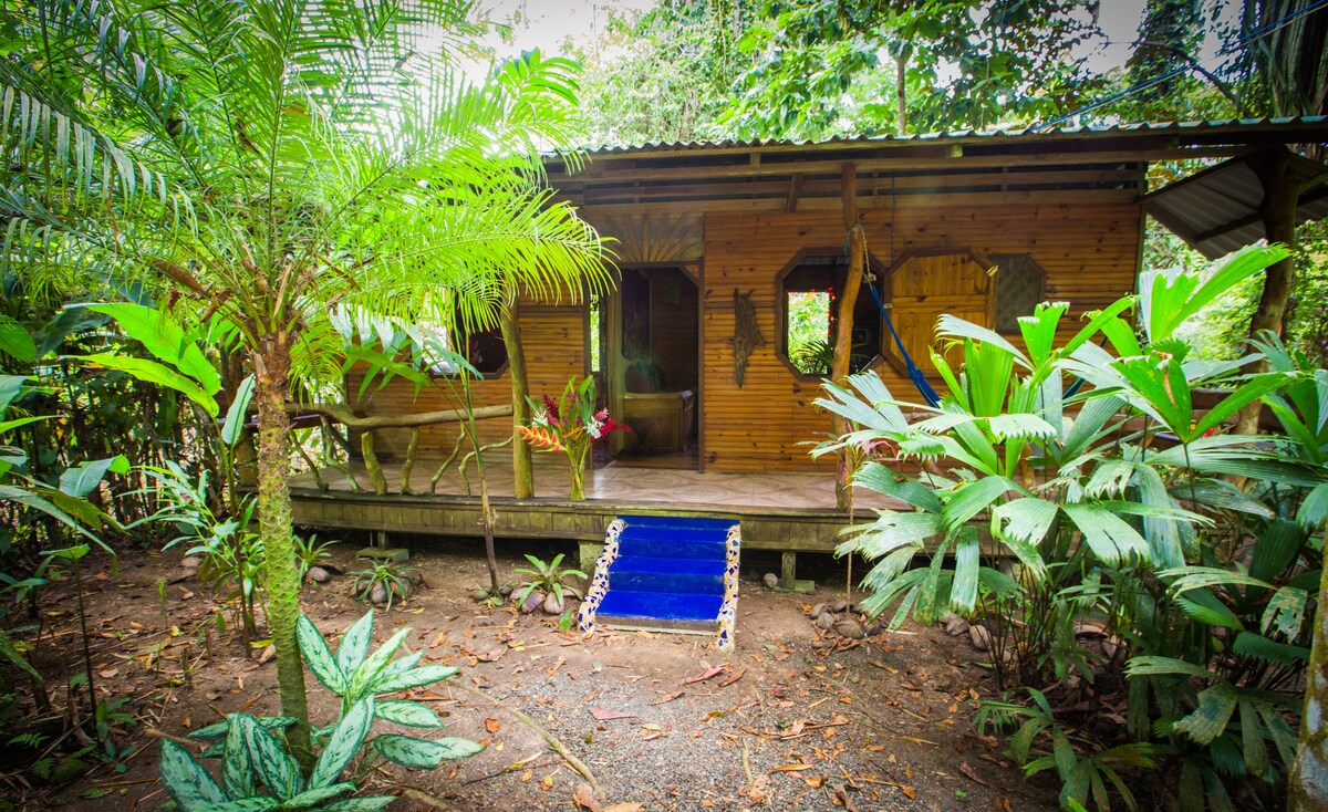 Schöner Eco-Bungalow für 2 Personen mit Terrasse, Hängematte, WLAN, Klimaanlage, Warmwasser und voll ausgestatteter Küche in einem kleinen Grundstück mit Pool in einem üppigen tropischen Garten. *5 Gehminuten vom Strand Playa Chiquita und eine 12-minütige Fahrt von der Innenstadt von Puerto Viejo entfernt. *Schattige Parkplätze plus zwei Ladeanschlüsse für Elektrofahrzeuge auf dem Grundstück (220 und 110 V)!