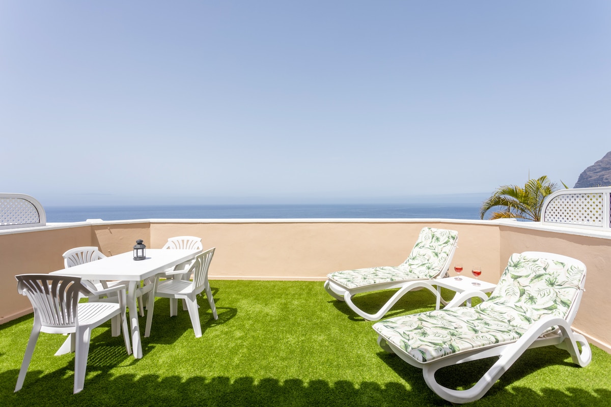 Es ist eine Wohnung mit sonniger Terrasse mit einem vollen Panoramablick auf das Meer, die Insel La Gomera, die Klippen von Los Gigantes, den Hafen und fantastische Sonnenuntergänge jeden Abend. Dies ist der ideale Ort für Paare und abenteuerlustige Seelen. Der schönste Strand, der von Klippen umgeben ist, ist in 5 Minuten zu Fuß erreichbar. In der Nähe der lokalen Bars, Restaurants, Supermärkte und anderer wichtiger Annehmlichkeiten bietet es einen perfekten Ort für deinen erholsamen Urlaub.