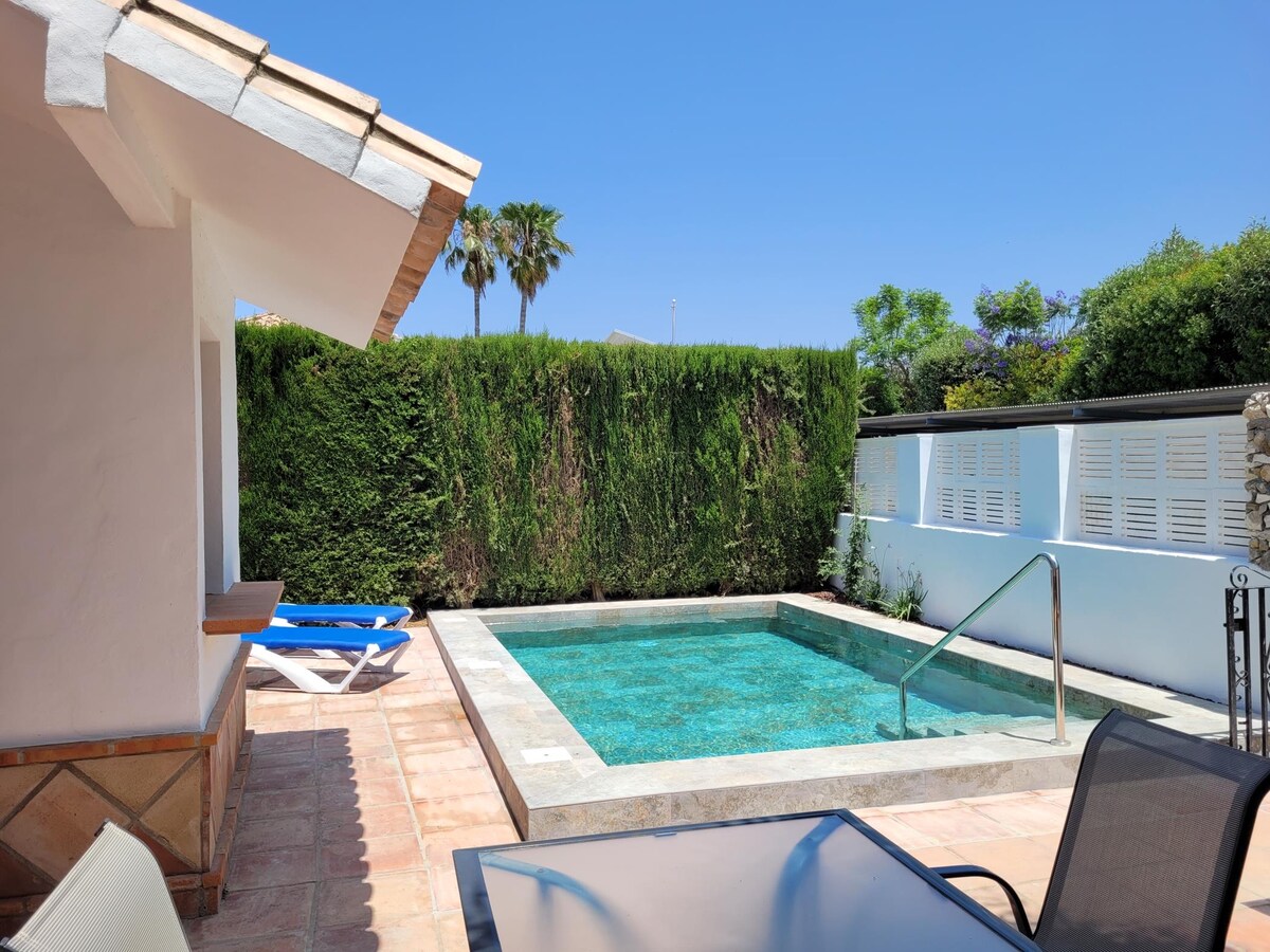 Genießen Sie einen Aufenthalt in einer schönen freistehenden Villa mit privatem Garten, die sich in einem Komplex mit großen, gepflegten Gemeinschaftsbereichen und einem Gemeinschaftspool befindet. Sie ist ideal zum Entspannen und Ausruhen in einer ruhigen, angenehmen Umgebung, nur 950 Meter vom Strand Fuente del Gallo entfernt.