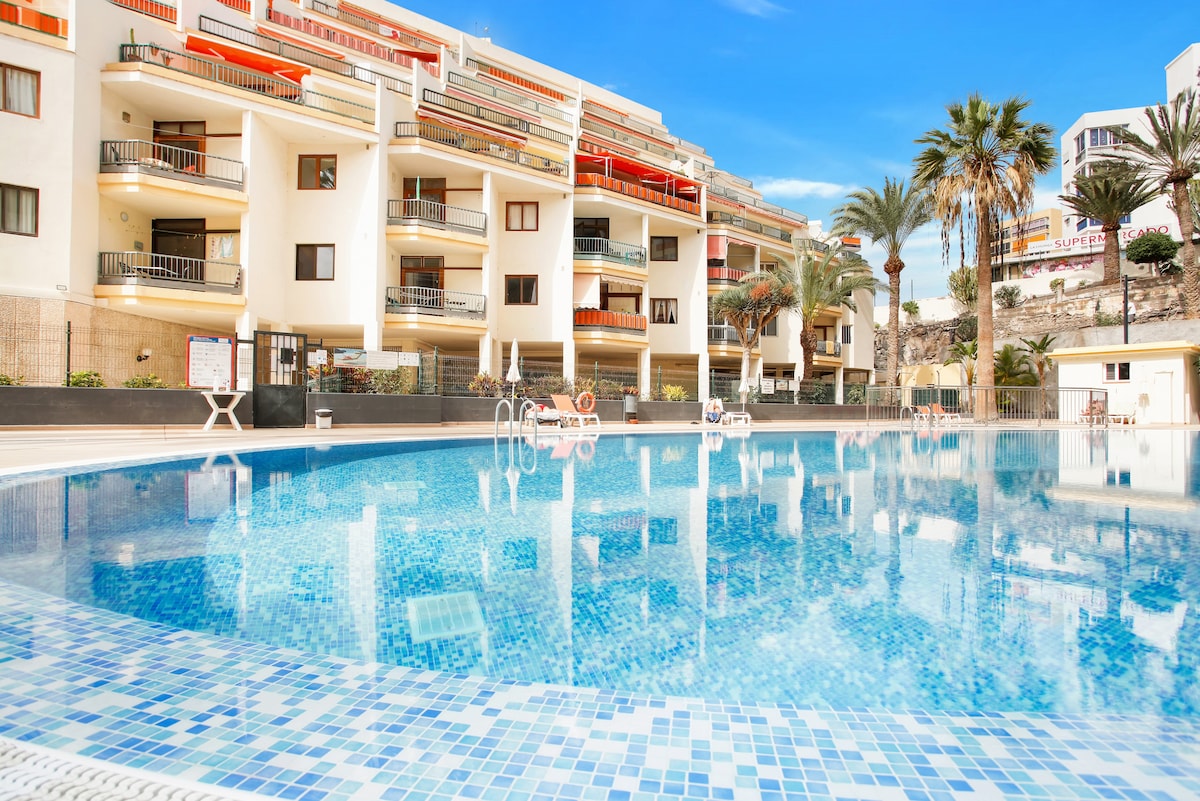 Fragen Sie mich nach einem Sonderpreis! Gemütliche Wohnung mit Blick auf den Pool. Nur 3 Minuten vom Meer entfernt. In der Nähe der Strände von Las Vistas und Los Tarajales. Es verfügt über einen großen Swimmingpool mit kostenloser Sonnenliege. Supermarkt täglich geöffnet und Apotheke 50 m entfernt. Nur 10 Minuten von der Bushaltestelle und 15 km vom Flughafen Teneriffa Sur entfernt. Die Wohnung verfügt über ein Wohnzimmer, eine ausgestattete Küche, ein Badezimmer, ein Schlafzimmer, eine Terrasse und WLAN. Schön für zwei Personen, die alleine reisen.