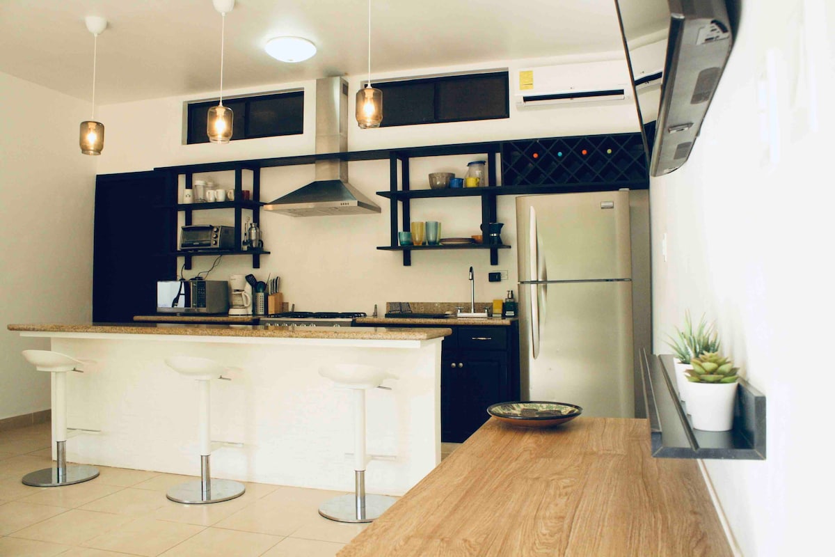 Sauberes und helles Haus in San Juan Del Sur, eingebettet in üppige tropische Bäume. Nur 5 Gehminuten vom Strand und 10 - 15 Gehminuten von der Stadt entlang des Strandes entfernt. Nah an der Aktion, aber weit genug für einen ruhigen Schlaf. Das Haus ist eine Oase, in der Sie nach einem Tag der Erkundung zurückkehren können, um ein Glas Wein auf der Terrasse zu trinken, im Pool zu schwimmen, auf der offenen Dachterrasse zu essen, sich auf der Hängematte zu entspannen oder einfach nur einen Film anzusehen.