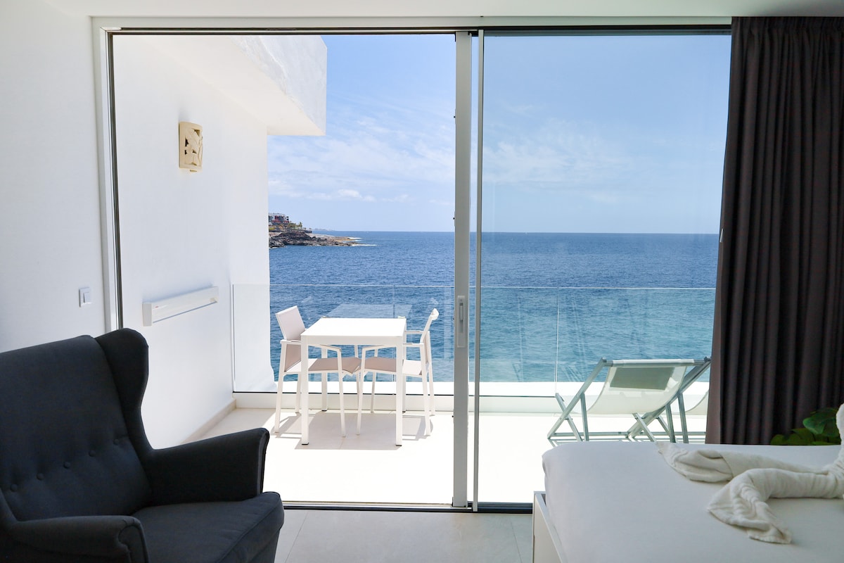 Gemütliche und voll ausgestattete Olas Suite mit Meerblick, mit direktem Zugang zum Strand 10 m, ideal für Meeresliebhaber. Sehr hell und mit unglaublicher Aussicht. Sehr ruhige und touristische Gegend im Süden von Teneriffa. Fahrradverleih, Ausflüge, Supermarkt, Restaurants, Apotheke, Bäckerei, Einkaufszentrum Rosa Center, ganz in der Nähe.