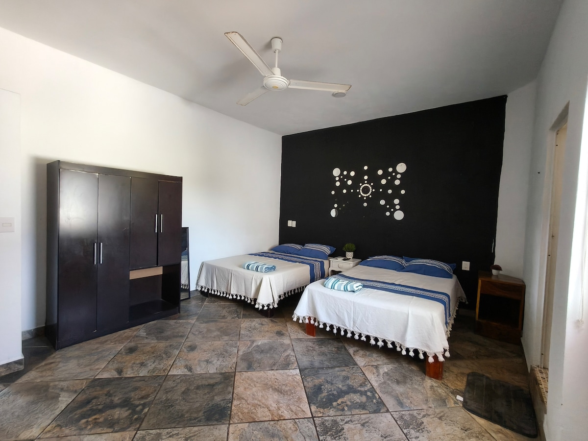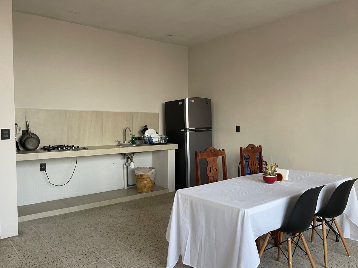 Entspannen Sie sich in unserer Wohnung im Erdgeschoss, ideal für 1 bis 5 Gäste. Denke daran, dass wir tierfreundlich sind. Du wirst in La Punta Zicatela sein, nur 2 Minuten zu Fuß vom Strand und 2 Blocks von der Hauptstraße entfernt, wo du alles hast, um Spaß zu haben und die Atmosphäre zu genießen, die immer da ist, von Restaurants, Bars, Eis, Geschäften und allem, was du hier brauchst, wird auf dich warten. Du wirst es lieben...