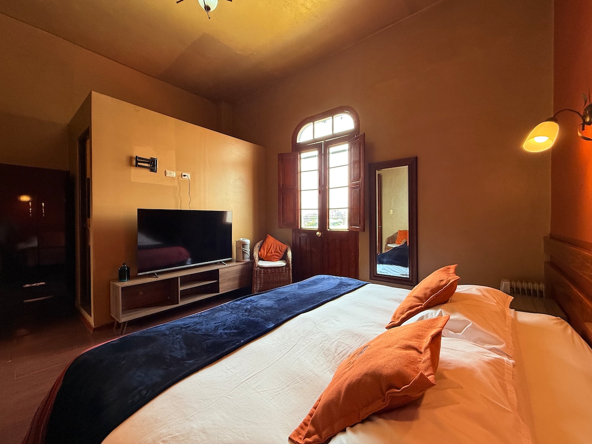 Genießen Sie ein gemütliches Zimmer mit einem Queensize-Bett, das mit einer bequemen Matratze, hochwertiger Bettwäsche und einer Einrichtung ausgestattet ist, die die Anden mit dem Klassischen verbindet und eine warme und authentische Atmosphäre schafft. Es verfügt über ein eigenes Bad, heißes Wasser, Kabel-TV, WLAN für Ihren Komfort. Das Zimmer ist gut belüftet und verfügt über große Fenster mit Blick auf den Innenhof, der aus einzigartigem und authentischem vulkanischem Quaderstein besteht. Die durchdachten Details und die Atmosphäre laden Sie zu einer angenehmen Erholung ein.