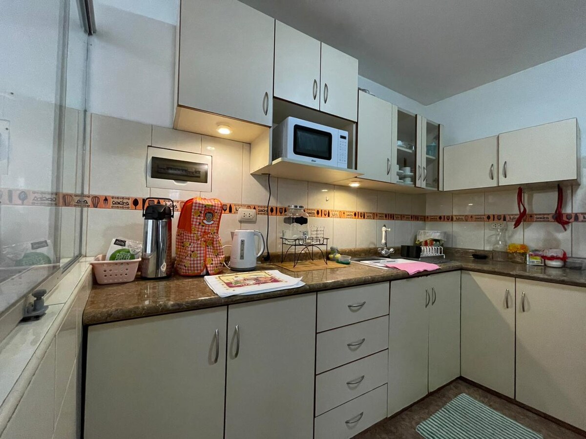 Hallo, wie geht es dir? Wir sind ein Familienhaus, wir möchten, dass du deinen Aufenthalt bei uns genießt und Cajamarca genießt. Unsere Wohnung befindet sich im dritten Stock. Sie verfügt über vier Zimmer mit eigenem Bad, Warmwasser und WLAN. Es hat eine Küchenzeile und eine Waschküche, am 5. oG sind die Markisen. Wir sind 5 Minuten vom Flughafen und 8 Minuten von den Einkaufszentren, 15 Minuten von der Innenstadt entfernt. Wir hoffen, du fühlst dich als Teil unserer Familie.