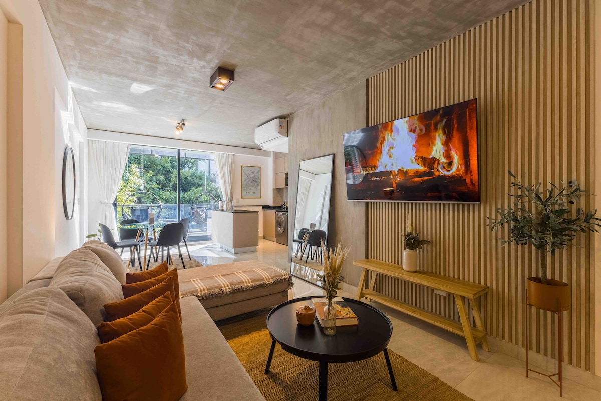 Tritt in diese fantastische moderne Wohnung im Herzen von Palermo Hollywood ein. Das mit einer modernen Ästhetik gestaltete Studio ist voll von eleganten Möbeln, reichen Holzmerkmalen und schwarz matten Akzenten. Entspanne dich im geräumigen Studio mit einem gemütlichen Sofa und einem Smart-TV. Das bequeme Bett, geteilt durch eine rustikale Holztrennwand, bietet einen gemütlichen, einladenden Rückzugsort. Erlebe Komfort mit hochmodernen Geräten wie Backofen, Elektroherd und Kühlschrank mit Gefrierfach, die alle mit einem stilvollen Marmor ausgestattet sind.