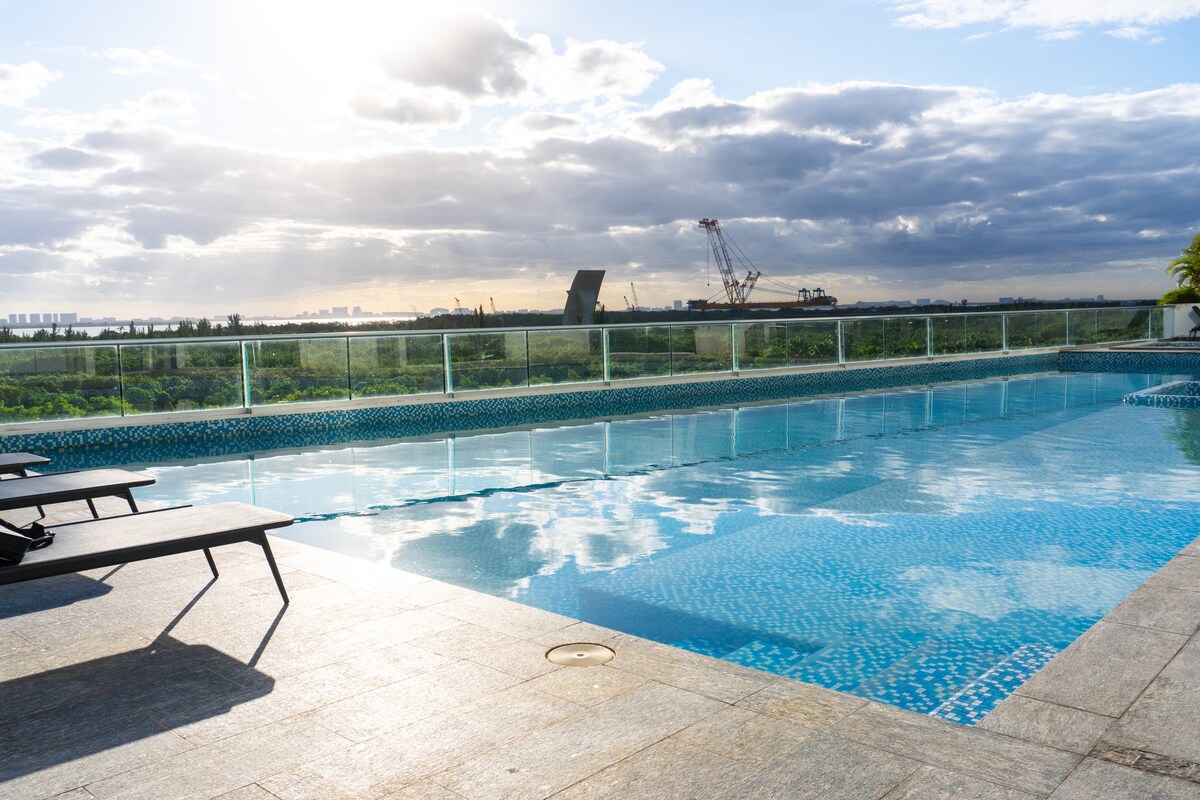 Brandneue wunderschöne Eigentumswohnung mit 2 Schlafzimmern mit TV, 2 Badezimmern, Klimaanlage, voll ausgestatteter Küche, Pool, Fitnessstudio, WIFI, 24/7 Sicherheit, Privatparkplatz für 2 Autos. Ausgezeichnete Lage in einem modernen gehobenen Viertel 5 Minuten von der Hotelzone entfernt. Zu Fuß erreichbar sind ein Einkaufszentrum (Plaza las Américas), Lebensmittelgeschäfte (Superama, 7Eleven), Restaurants, Cafés und eine Bushaltestelle.