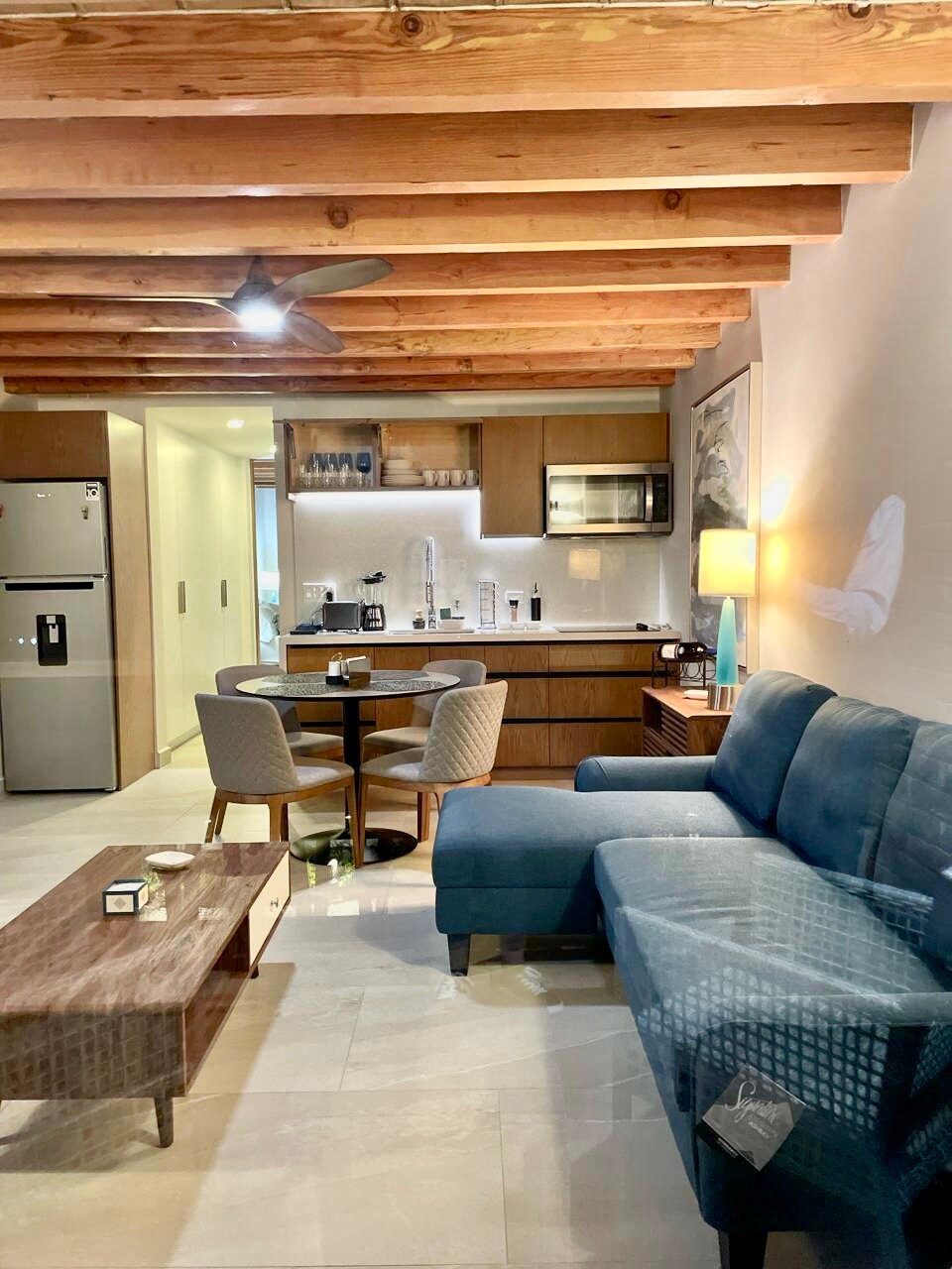 Wabi-sabi Department, Japanese philosophy that finds beauty in the imperfections of life. It has 1 bedroom (king bed), 1 full bathroom, terrace, living room, dining room, 100% electrical installations, laundry center, Nespresso coffee machine, kitchen with microwave, dishwasher, electric stove and utensils to be creative in the kitchen, TV 65" with subscriptions to platforms, board games, tourist guides for the region, chairs, towels and umbrellas to go to the beach.