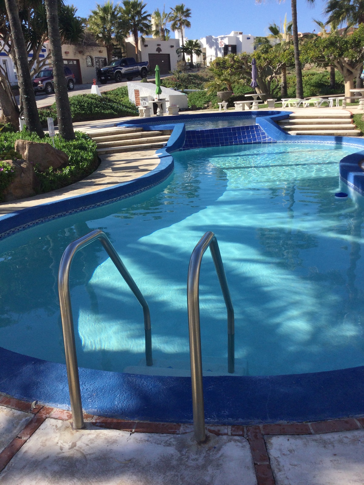 Refréscate en nuestras 2 albercas y disfruta de bellos atardeceres de Baja California en la tranquilidad de este alojamiento romántico y céntrico. Relájate con su vista al mar desde su terraza con asador y comedor. Sal a caminar y respirar aire puro por las mañanas en sus andadores. 2 áreas comunes con asadores, alberca y jacuzzi. Fraccionamiento privado con seguridad 24/7. A solo 35 minutos del Valle de Guadalupe y Ensenada, a 10 minutos de Puerto Nuevo y 1 hora de la garita de San Ysidro.