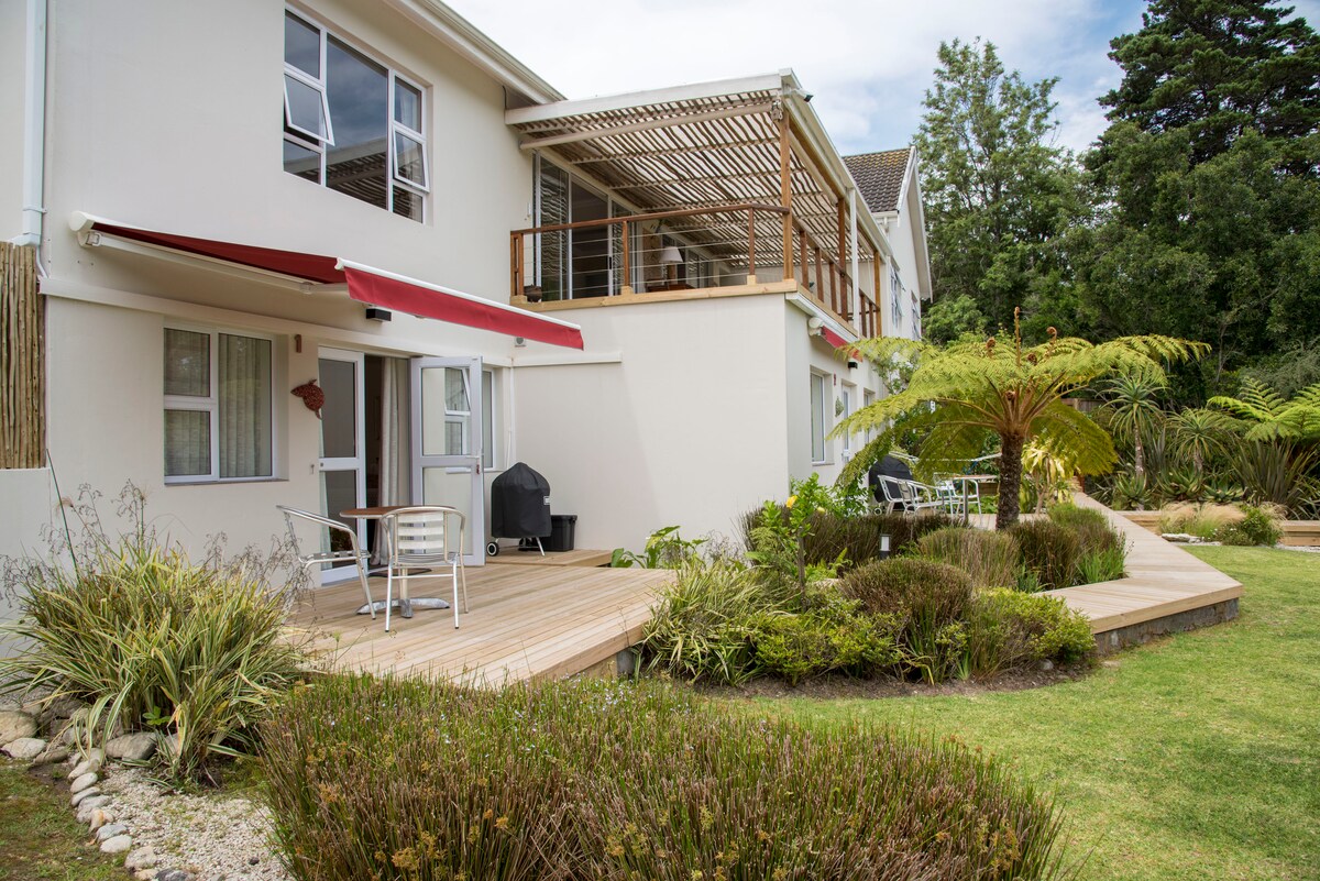 Comfortable, stylish 2 bedroom apartment with private entrance, an elevated oasis in the beautiful Knysna suburb of The Heads. Lagoon View Apartment is a sunny and warm space. Nestled and sheltered in the mountainside, the apartment offers magnificent views over the Knysna estuary towards the distant Outeniqua Mountains. Enjoy a glass of wine on our mountain gazebo and experience bird life in the tranquil garden with the backdrop of endless views, peaceful surroundings and spectacular sunset.