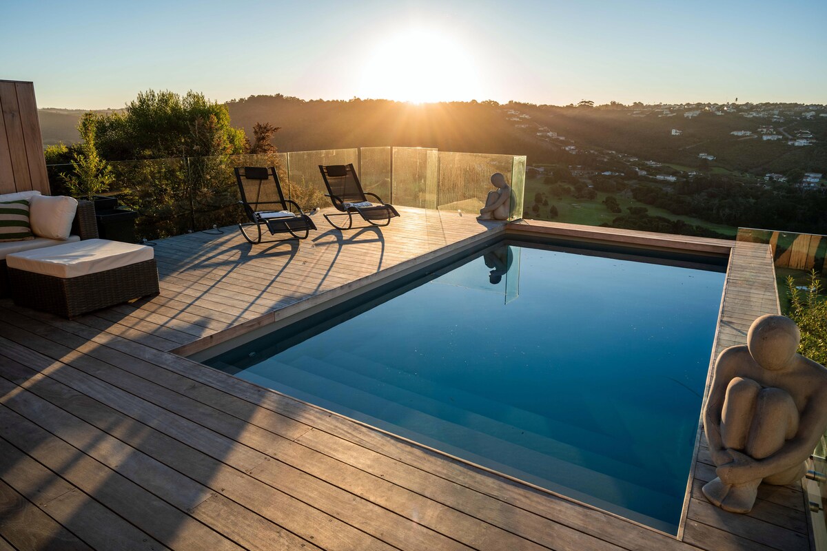 Auf einem Hügel über der Knysna Lagune gelegen ist Maison Mahogany - mit ihrer atemberaubenden Aussicht auf die Knysna Lagune von nahezu allen Teilen des Hauses - der perfekte Ort, um den Knysna und Garden Route Lifestyle maximal zu leben. Wasser, Luft, Erde. Ein Holzhaus mit begrüntem Living Roof um ein Klima der Ruhe und Erholung zu schaffen.