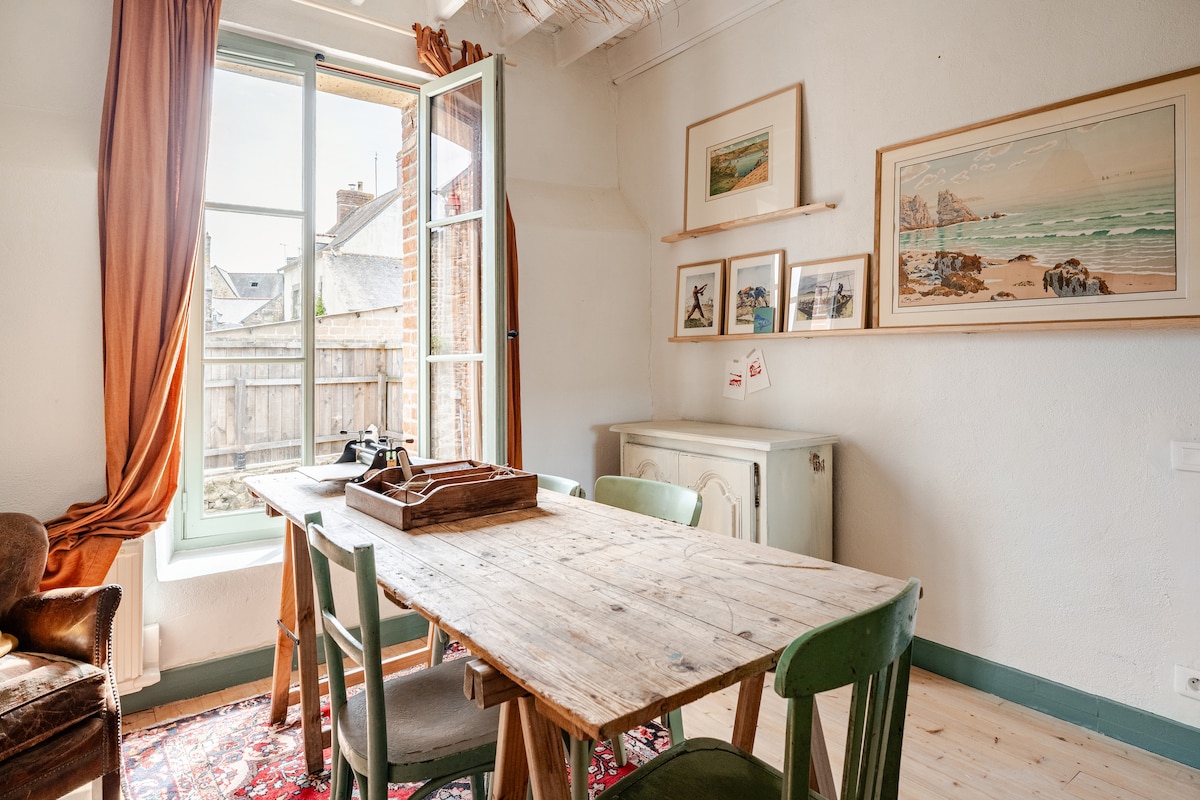 Sur la place du village de St-Suliac, l'un des plus beaux villages de France, un cocon pour vos vacances ou séjours créatifs. Juste en face de l'épicerie, à qq mètres de la boulangerie, de la brocante, de l'office de tourisme, de l'église, de la plage et des cafés-restaurants. Hyper central ! C'est l'atelier d'artiste de Virginie Bregeon qui habille chaque pièce d'objets chinés aux couleurs de la Bretagne et invite de grands artistes bretons (Mathurin Méheut, Henri Rivière) sur les murs...