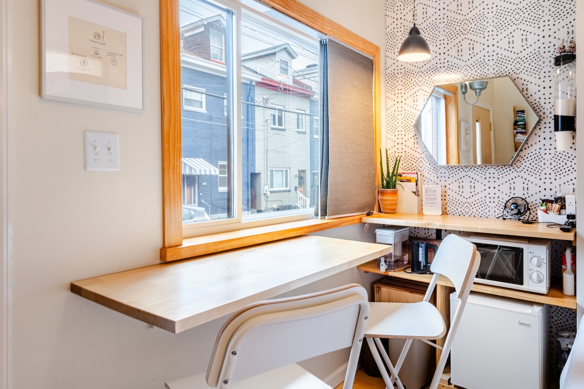 The Nesting Box is an ideal space to return to and recharge in after “free-ranging” locally. Comfortable, cool, and centrally located to the best of Butler Street. Designers collaborated to maximize the minimal space with creative comforts for experiencing "tiny living". Our shipping container addition led us to have 2 front 🚪. We welcome guests to our on-street private guest suite. Urban family homestead with 1 🐈⬛, 2 🐕, and 3 🐓 that resided with us for 5 years (recently rehomed to farm).