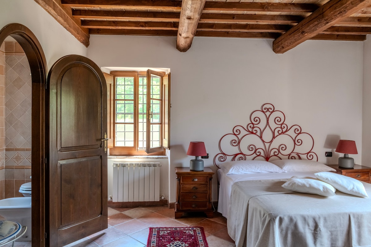 Escape to the rolling hills of Umbria in this updated farmhouse (90 m2 over 2 floors) that retains its original charm. The home features classic beamed vaulted ceilings, original stone finishes, an indoor wood-burning fireplace, private entrance and a private garden terrace. The shared pool has a large sun lounge area. If your favourite dates aren't available anymore take a look at our orange apartment. Orange: https://www.airbnb.com/rooms/plus/9429730