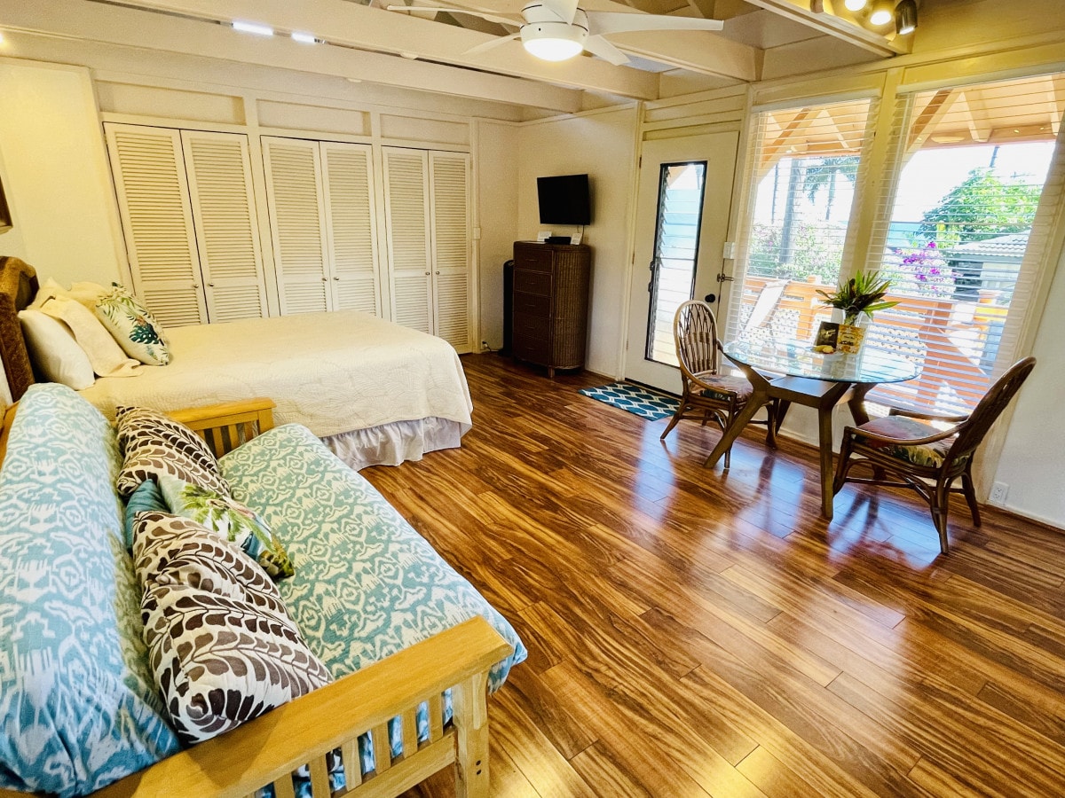 Clean, quiet and comfortable guest suite in Princeville. Lockout room on opposite side of the main house with private entrance and parking space. The room has a queen bed, mini-fridge, microwave, keurig, WiFi, smart TV and AC. New en-suite bathroom with walk-in shower. Small seating area outside, perfect spot to enjoy a morning cup of coffee. Within walking distance to Happy Talk, Hanalei Bay Resort, Queen’s Bath and Hideaways.