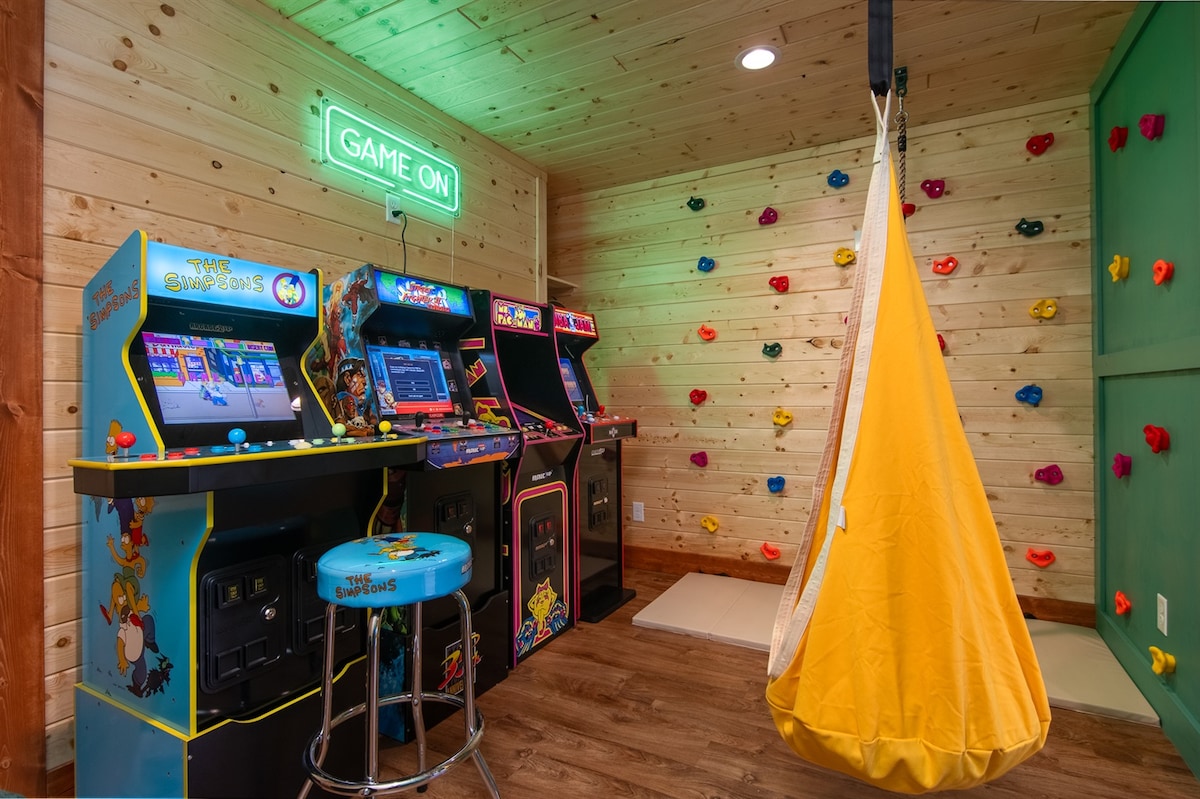 A family cabin like no other — where adults unwind and kids have the time of their lives. Set on two private wooded acres with 300 feet of shoreline, this lakefront retreat offers peace and privacy for parents and endless adventure for kids. The highlight? A one-of-a-kind Adventure Loft filled with arcade games, rock-climbing walls, and themed sleeping pods — there’s nothing else like it in the area. Whether you’re roasting marshmallows by the fire, soaking in the hot tub, swimming off the doc