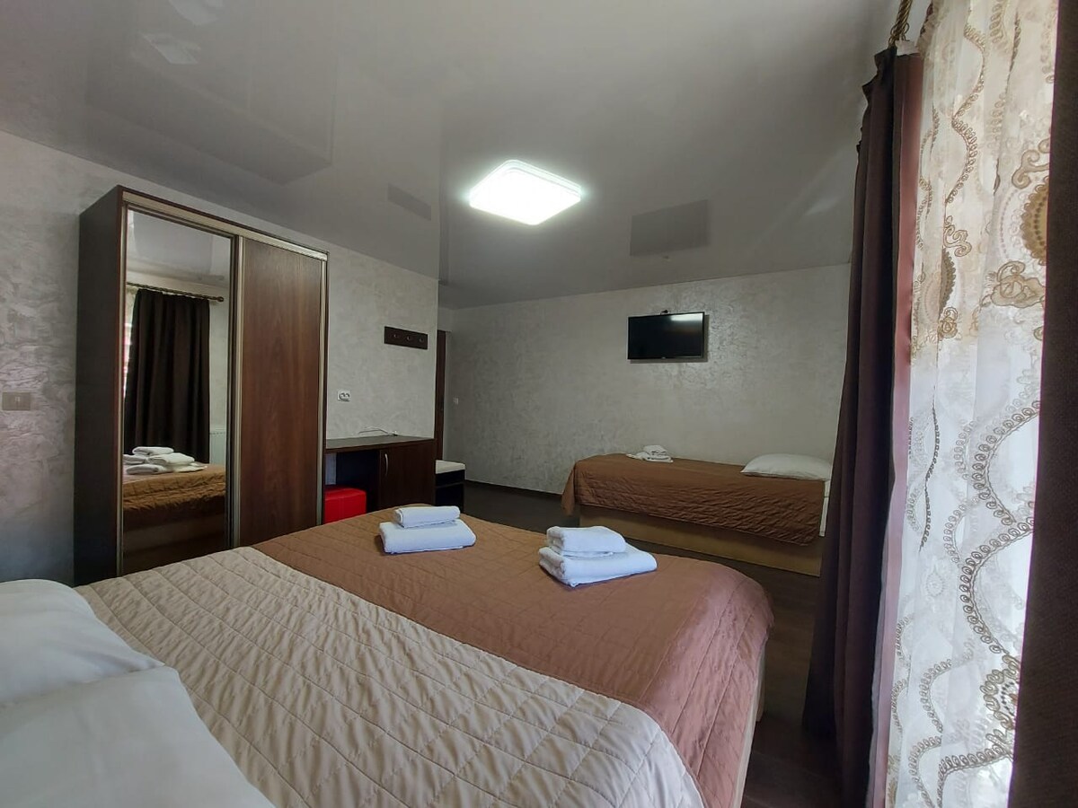 Новий тримісний номер має власний балкон з чудовим видом. У номері є велике двоспальне і односпальне ліжко, власна ванна кімната. плазмовий телевізор, якісне покриття інтернету і надається безплатна стоянка для авто. Також гості мають доступ до спільної кухні на якій можуть самостійно готувати. На відстані 40 метрів є кафе де наші гості замовляють сніданки. В 150 метрах від нас є лижний спуск R1.