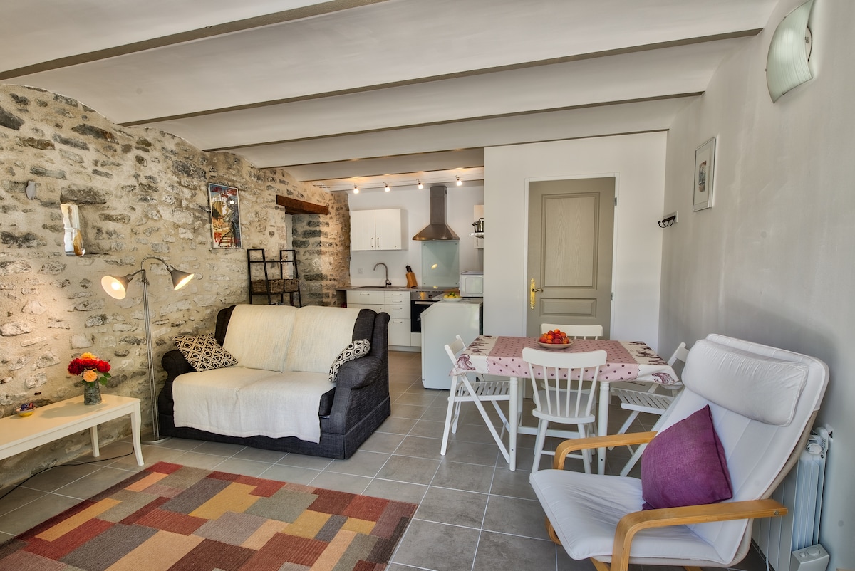 Situé dans la partie ancienne du village, dans une rue piétonne, ce studio indépendant est au calme. La voûte en pierre permet d'avoir de la fraîcheur tout l'été. Chauffage au sol pour l'hiver. La surface est de 30m2 avec salle de bain et cuisine. On se rend à pied à la rivière pour s'y baigner et dans le village vous trouverez un bar, une boulangerie et un caviste. Départs de sentiers de randonnées juste au dessus. Possible de sortir une table pour manger devant dans la rue.