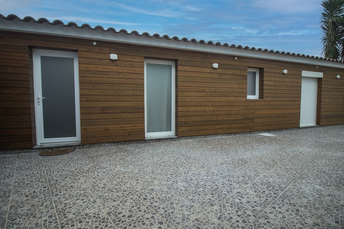 Holzhaus mit Blick auf den Sonnenuntergang am Meer