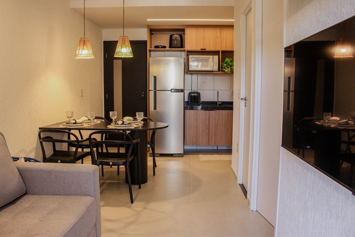 Wohnung für bis zu 4 Personen. Wohnzimmer mit Queensize-Schlafsofa, Kabel-TV mit Netflix, WLAN. Suite mit 1 Doppelbett und Klimaanlage. Bettwäsche und Handtücher werden zur Verfügung gestellt. Voll ausgestattete Küche. Nutzen Sie diesen Raum, um Ihren Urlaub am Strand zu einem Traumurlaub zu machen! Die atemberaubende Aussicht, die Brise, die Sie beruhigt, und dazu der Komfort einer funktionalen Wohnung voller guter Energie! Erleben Sie diesen Zauber, ich erwarte Sie!