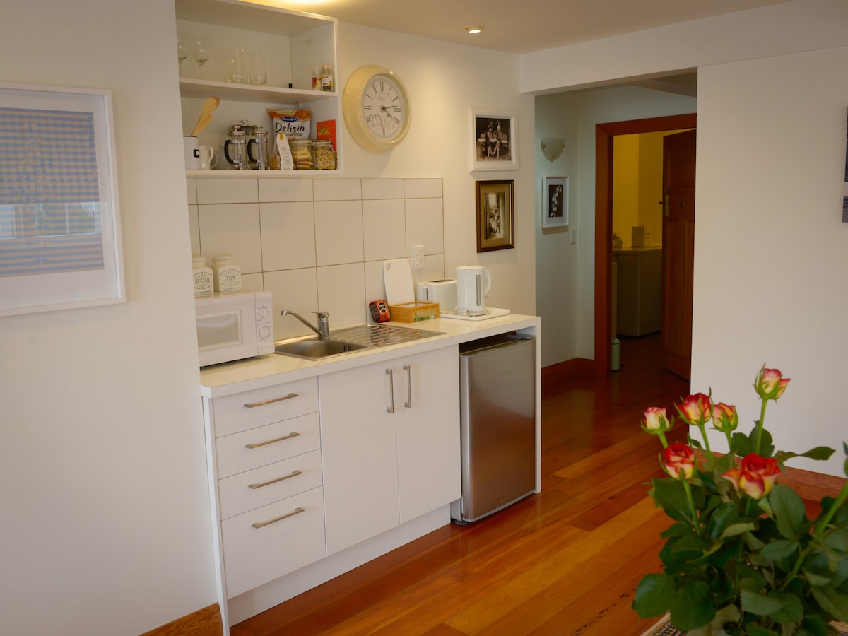 Unser unabhängiges Studio befindet sich abseits des Haupthauses und ist ideal für ein Paar, Solo-Abenteurer und Geschäftsreisende. Wir bieten ein bequemes Bett und ein kontinentales Frühstück. Das Studio bietet einen schönen Blick über Ackerland bis zu den Tararua Mountain Ranges und Meerblick auf der anderen Seite. Ein 10-minütiger Spaziergang führt dich über malerische Wege zu unserem malerischen Strand. Peka Peka Beach ist ideal zum Schwimmen, Spazierengehen oder einfach nur zum Sitzen und Entspannen. Es gibt unzählige Strecken und Wege, die von hier und innerhalb der Kapiti-Gegend zum Radfahren und Wandern oder Trampen zugänglich sind. Ein Ausflug nach Kapiti Island von Paraparaumu ist ein Muss für Naturliebhaber. Für diejenigen, die einen entspannteren Aufenthalt wünschen, gibt es wirklich gute Cafés und Restaurants in der Nähe. Das Harrison's Garden Cafe in Peka Peka ist großartig und es gibt eine gute Auswahl an Restaurants am Waikanae Beach. Das Shoreline Cinema in Waikanae Township, 5 Autominuten entfernt, auch für Kaffee und Kuchen oder gut ausgewählte Weine.