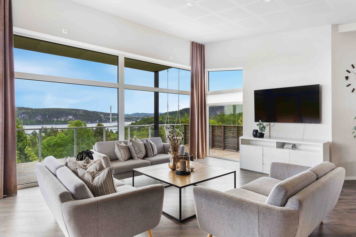 Unique and modern nordic design. idyllic and undisturbed surroundings in harmony with nature. Panoramic view over the fiord. 20 min. from Sandefjord/1,5 hour from Oslo/1,5 hour from Kongsberg alpin. The beach in front is Bronnstadbukta, area with rich nature, perfect for adults and kids. Great hiking right outside, with numerous popular summit hikes and hiking trails. Beautiful fjord with islets and reefs if you travel by boat. Cabin also suitable for two families with 2 baths ans 4 bedrooms.