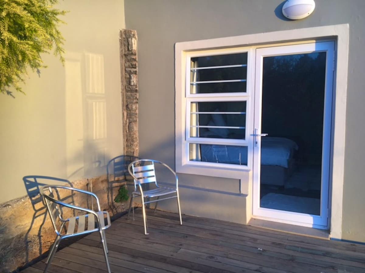 Komfortable Gartenwohnung in einer ruhigen Gegend, 1,5 km vom Strand und 2 km vom nächsten Einkaufszentrum entfernt. Die Küchenzeile ist mit einem Wasserkocher, Toaster, Mikrowelle, Bar-Kühlschrank, 2-Platten-Herd sowie Geschirr und Besteck ausgestattet. Das Bett ist ein Doppelbett. Es gibt einen Bereich neben der Einheit, wo du deinen morgendlichen Kaffee trinken kannst, während du den Vögeln lauschst, oder einen abendlichen Braai genießen kannst. Es gibt einen 32-Zoll-Fernseher mit Netflix und WLAN in der Unterkunft. Solarenergie sorgt dafür, dass es keinen Lastabwurf gibt.
