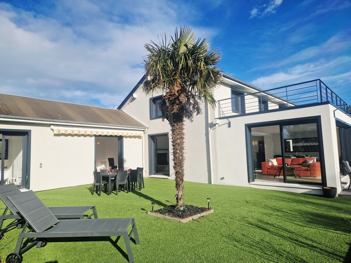 Neues, modernes Haus von 160 m2, fertiggestellt im März 2021. Außergewöhnliche Lage im Herzen des charmanten Badeortes Barneville Carteret an der Klippe. Atemberaubende Aussicht auf das Meer gegenüber der Insel Jersey, die Sie von der großen, nach Süden ausgerichteten Terrasse von 35 m2 aus genießen können. Wunderschöner Sandstrand 2 Minuten zu Fuß unterhalb des Hauses (Strand der "Potinière") Vom 28. Juni bis 30. August 2025: mindestens 7 Nächte + An-/Abreise nur am Samstag