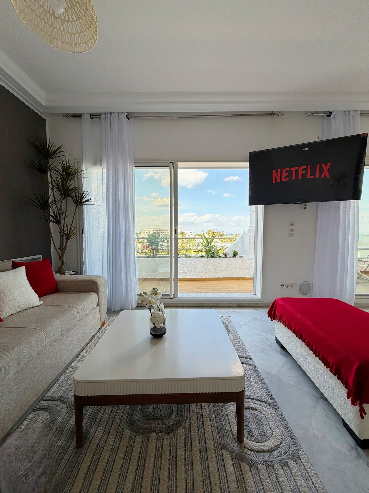 Notre appartement est situé dans la zone touristique de Sousse, à seulement 5 minutes à pied du Port El Kantaoui. Profitez d’une vue magnifique sur la mer, la piscine et les montagnes, dans une résidence calme et sécurisée. Avec une cuisine bien équipée, climatisation et TV Smart. À proximité : • Port El Kantaoui (5 min à pied) • Parc d’attractions et aquapark • Plage, restaurants accessibles à pied Un lieu idéal pour un séjour de détente, de soleil et d’élégance au cœur de Sousse.