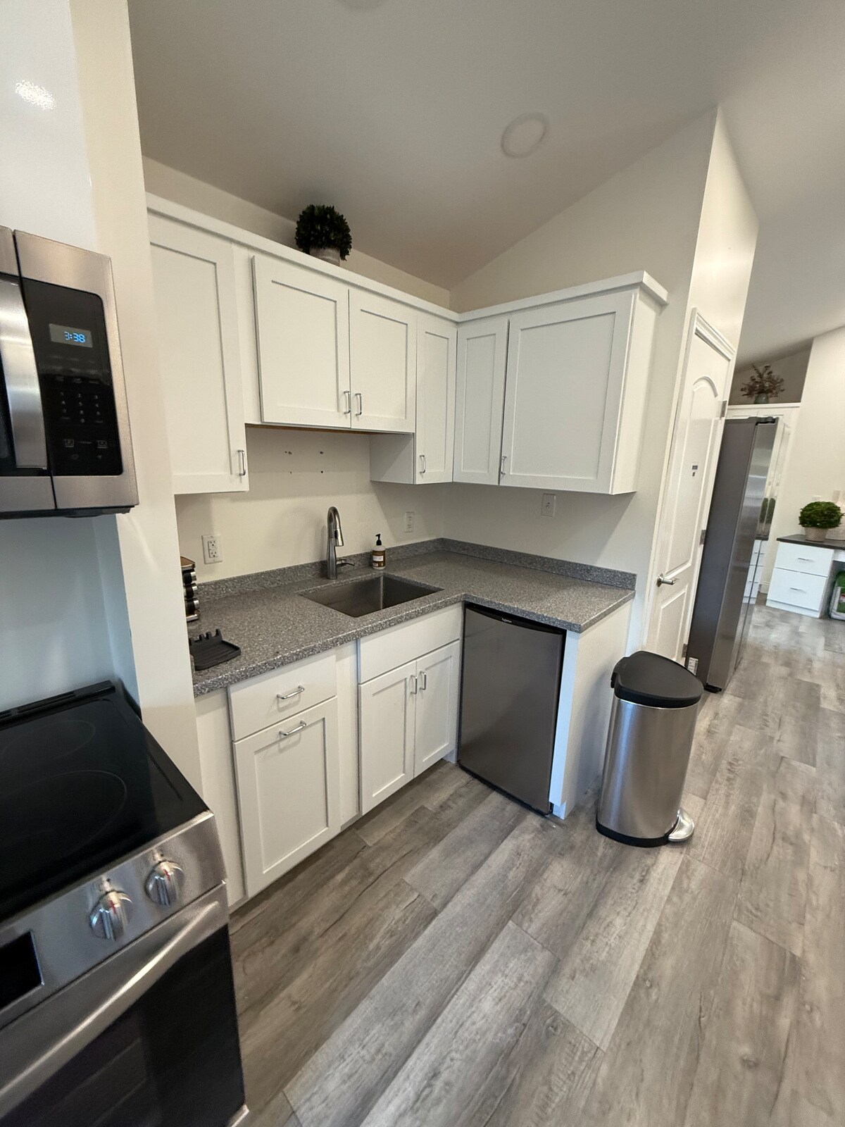 Kick back and relax in this calm, stylish space. The dining table accommodates 6 and 4 additional seats can be found at the kitchen island. Farm-style bathrooms feature luxury towels and amenities. High-efficiency washer and dryer. 1 Queen bed, 3 full beds, and a full sleeper sofa. Attached garage. Dedicated office space located in a sunroom with high-speed internet for the professionals out there. Keypad door entrance allows for a seamless check-in. And, yes, there is a coffee maker!