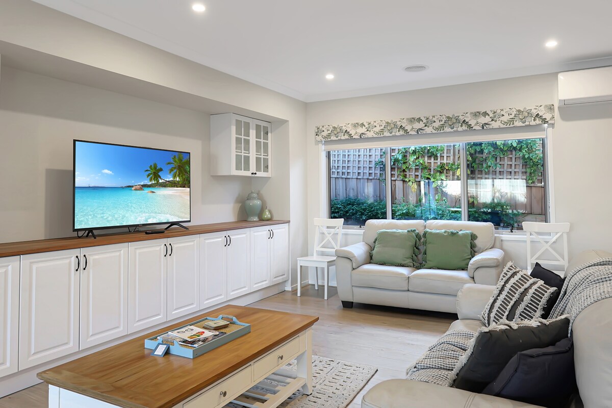 Das Zuhause ist dort, wo das Herz ist. Entfliehe dem Trubel des Stadtlebens und entspanne dich in meinem anmutig eingerichteten Zuhause, das eine neue Infrarot-Sauna im Freien bietet. La Casa Serenitá ist ideal für Paare oder kleine Familien, die ein erholsames Wochenende suchen, oder für Geschäftsreisende, die unter der Woche einen ruhigen Rückzugsort suchen. Das Haus befindet sich in günstiger Lage in einer ruhigen Gegend in der Nähe des Geelong CBD, der Uferpromenade, des GMHBA-Stadions sowie aller Städte oder Touristenattraktionen auf der Bellarine-Halbinsel.